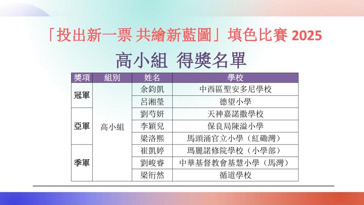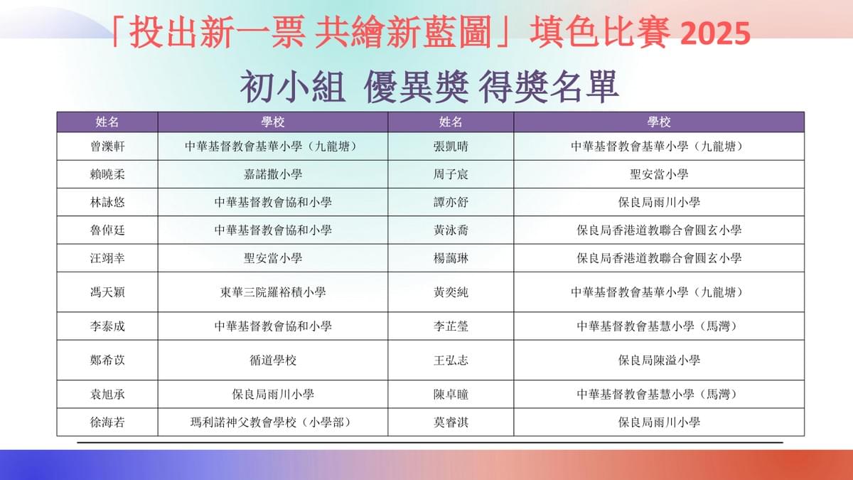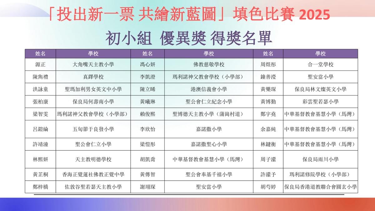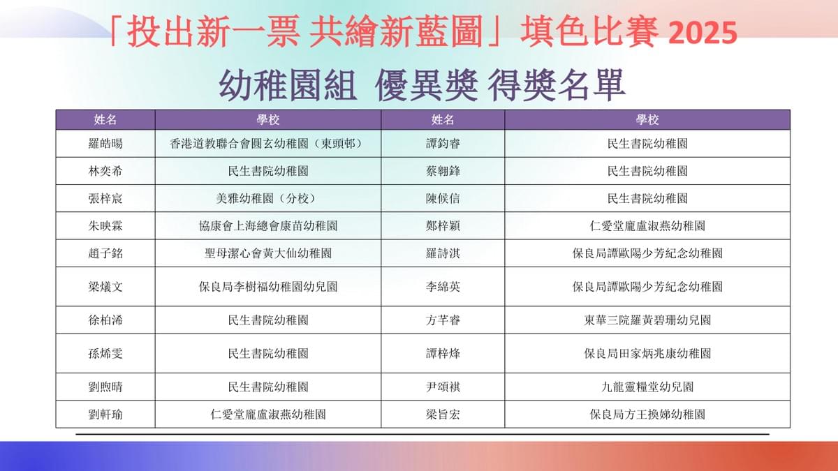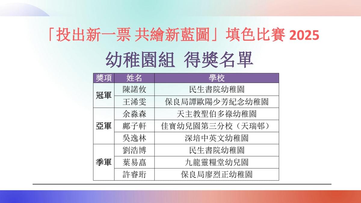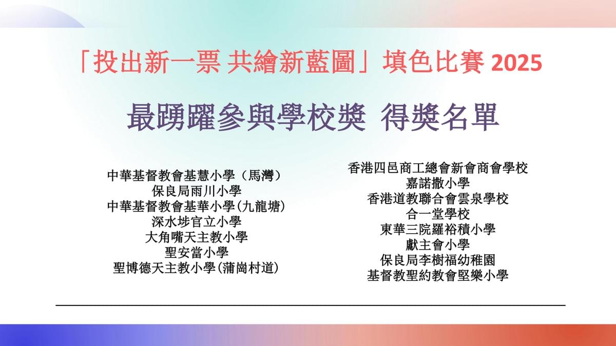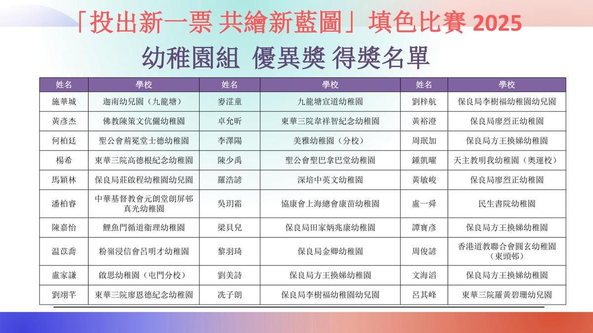 為培養公民責任感,鼓勵學生、家庭及社會大眾共同關注並積極參與新一屆立法會選舉,齊心協力建設更美好的香港,青新網絡、九龍地域校長聯會及香港幼稚園教育專業交流協會聯合舉辦以「投出新一票,共繪新藍圖」為主題的全港幼稚園及小學填色比賽。此次活動不僅是一場藝術競賽,更是一次極具意義的公民教育實踐。通過填色創作,學生能夠以視覺藝術表達對未來社會的想像與願景,從而加深對社會發展的認識與歸屬感。同時,活動鼓勵家庭與學校共同參與,促進親子互動,並引導社會大眾關注公共事務,凝聚共識,共同為香港的未來貢獻力量。