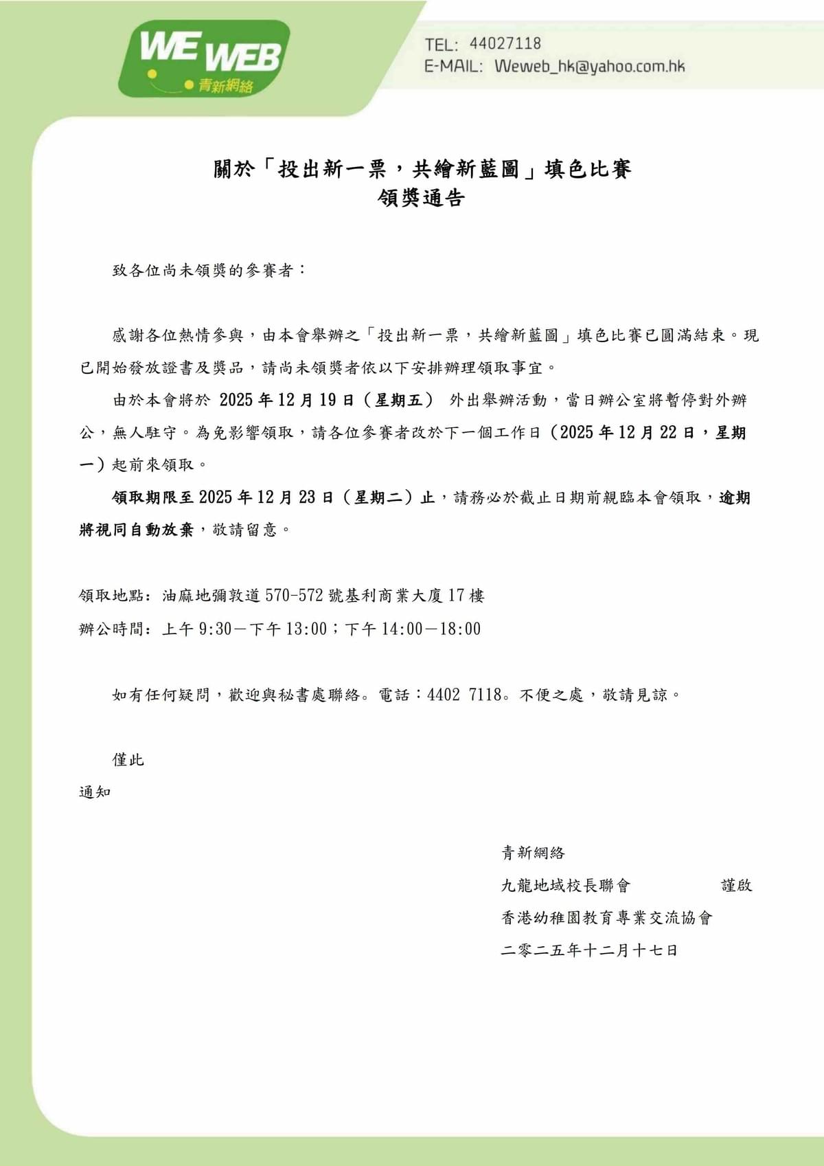 由青新網絡、九龍地域校長聯會及香港幼稚園教育專業交流協會聯合舉辦的「投出新一票,共繪新藍圖」填色比賽,已於日前圓滿結束。本次比賽共收到8,481 份參賽作品,競爭相當激烈。經專業評審後,得獎名單已正式公布,頒獎儀式亦已於 12 月 14 日順利舉行。